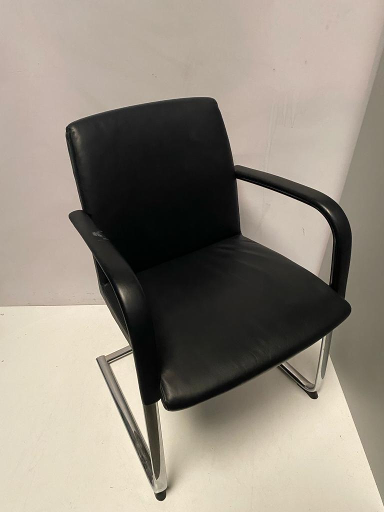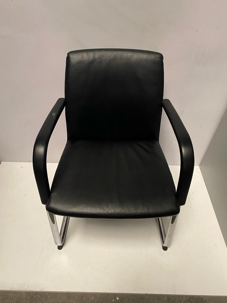 SILLA CONFIDENTE CUERO NEGRO PATÍN CROMADO. BRAZO DAÑADO.